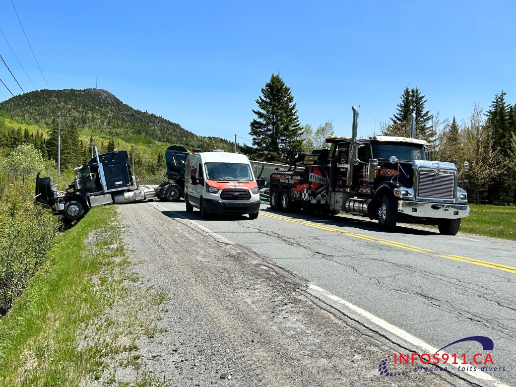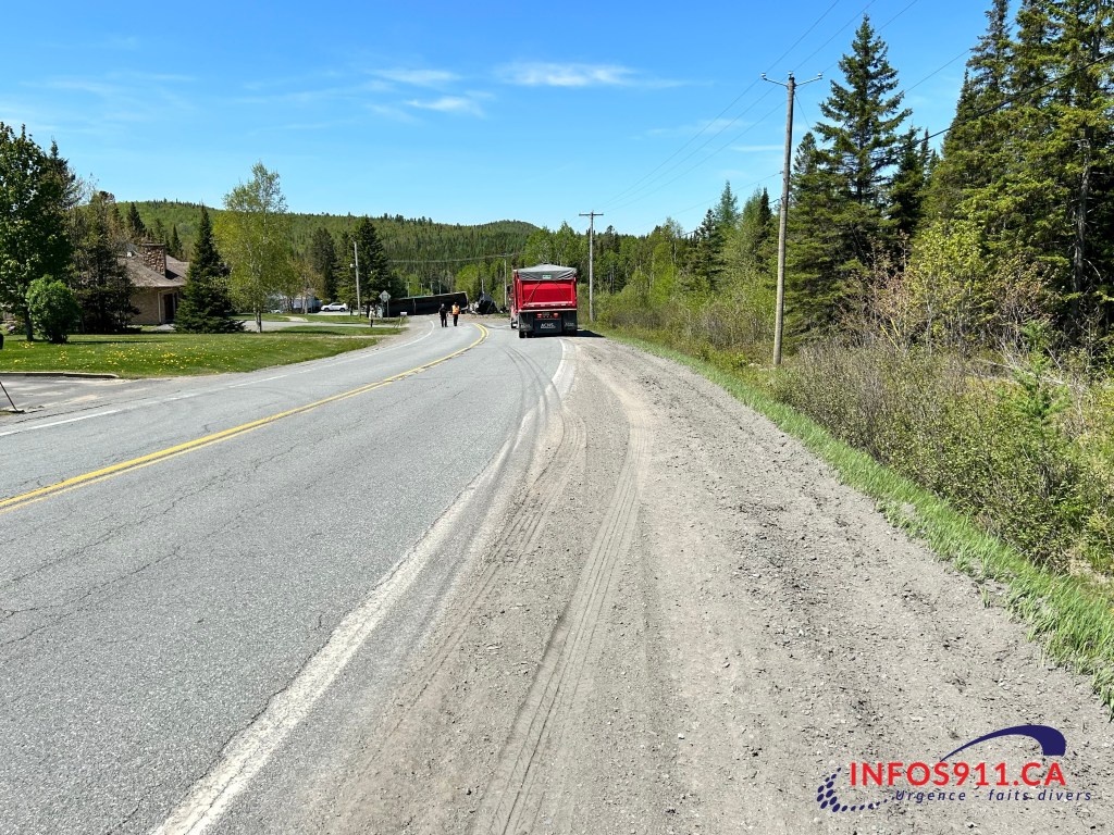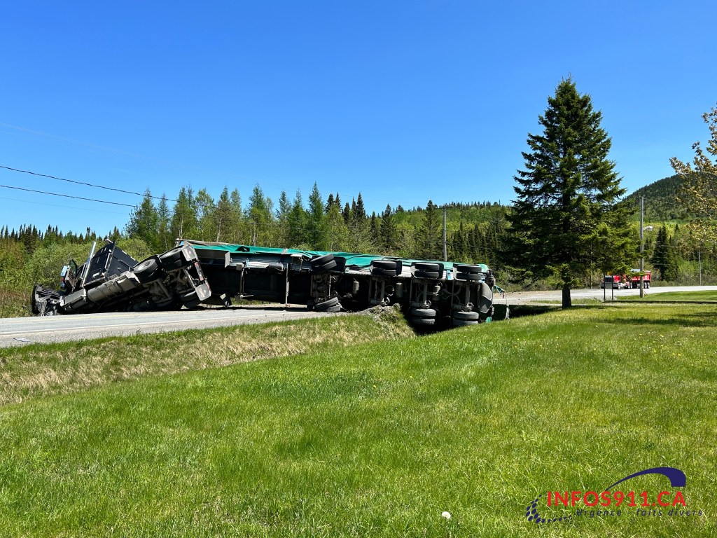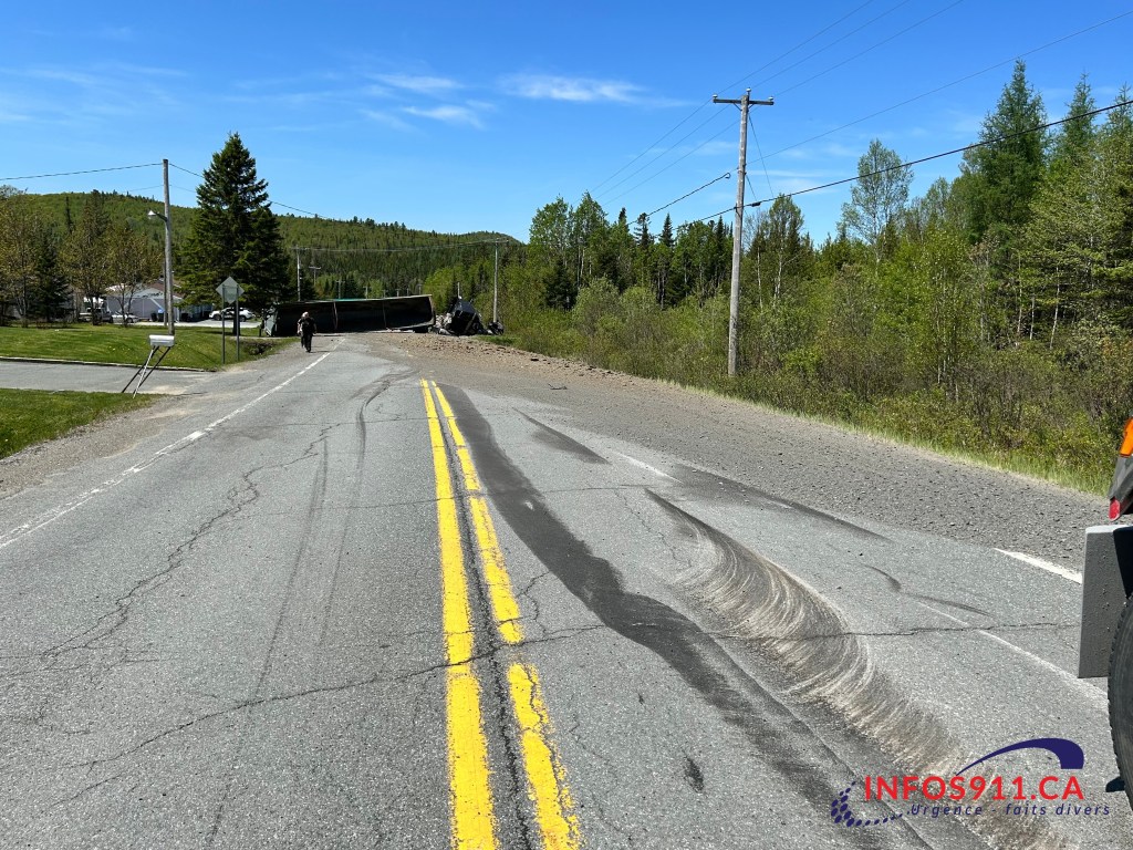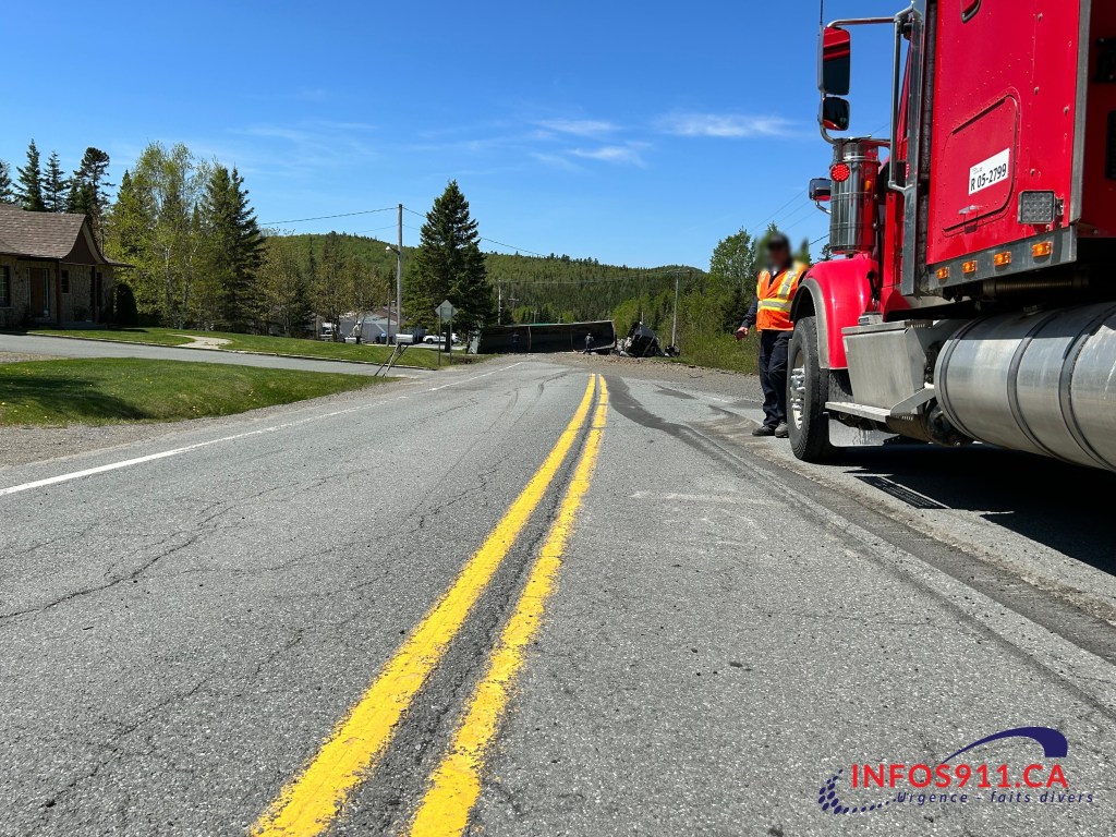 Le conducteur du camion a été transporté au centre hospitalier, mais il ne semblait pas blessé gravement lors de notre passage sur place.
