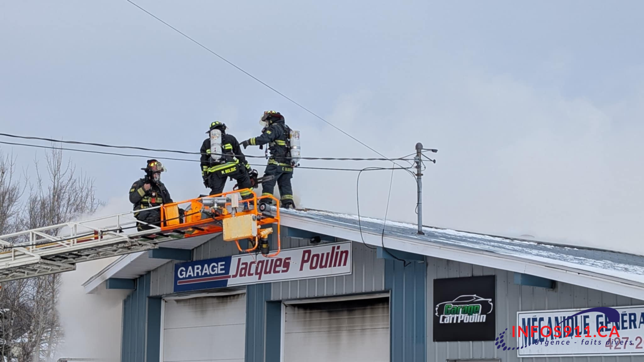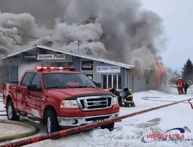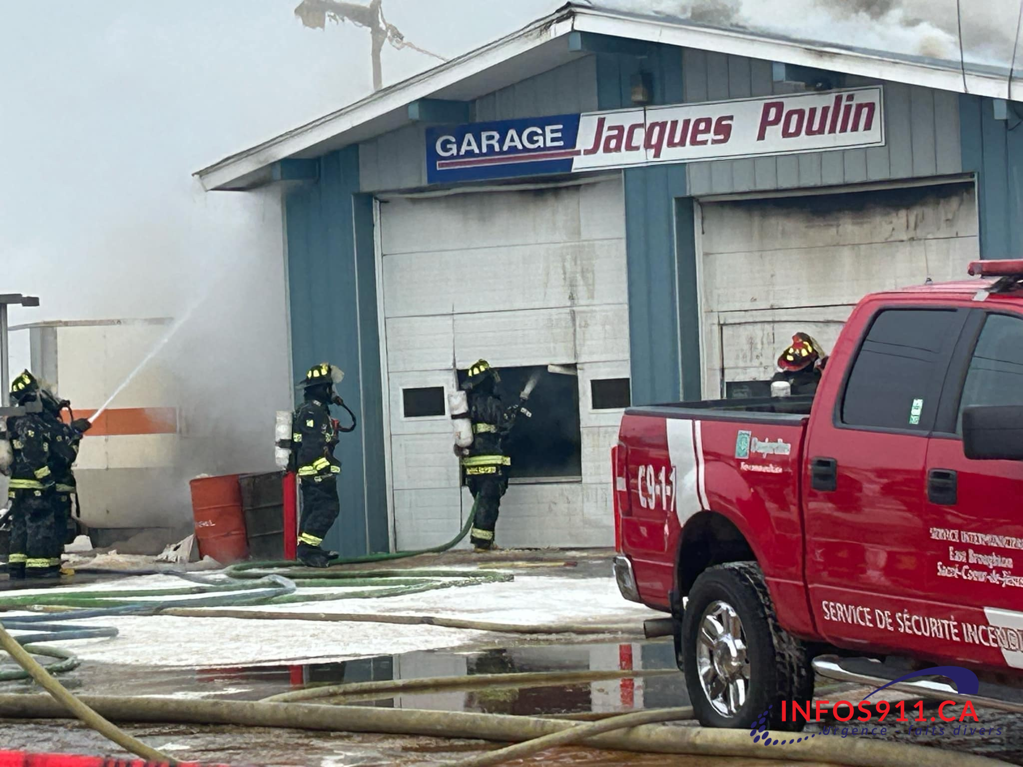 Depuis environ 11h10, les pompiers du service incendie d’East Broughton combattent un incendie majeur au garage Jacques Poulin, situé sur la 10e avenue Sud.